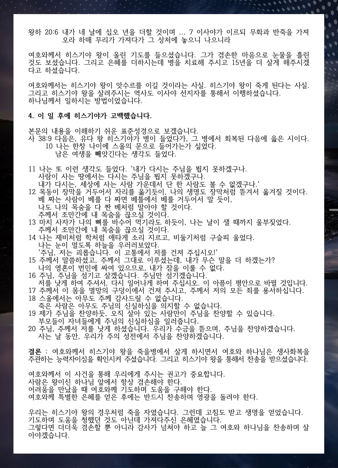 108°ú ¿©È£¿Í²²¼­ È÷½º±â¾ß¸¦ °íÄ¡½É (»ç 38:4~6)